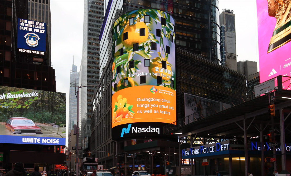 新会柑亮相美国纽约时代广场纳斯达克大屏。