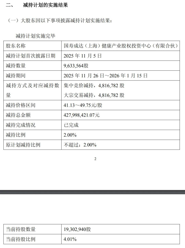 这一波下来,国寿成达合计减持约963.36万股,占总股本的2.00%;减持的价格区间在41.13元/股至49.75元/股之间,减持金额大约4.28亿元。