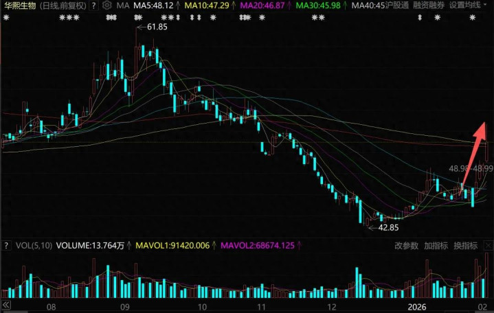 接着,2025年9-12月,华熙生物走出单边下跌走势,股价从61.85元一度跌到42.85元,不到三个月跌去30%以上。