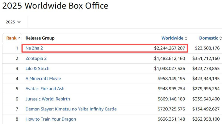 迪士尼影业出品的好莱坞动画大片《疯狂动物城2》,还有詹姆斯卡梅隆执导的2025年度重磅好莱坞科幻大片《阿凡达3》,各自的全球票房表现都远不及预期,它们到最后也都没能撼动《哪吒2》的年冠地位。
